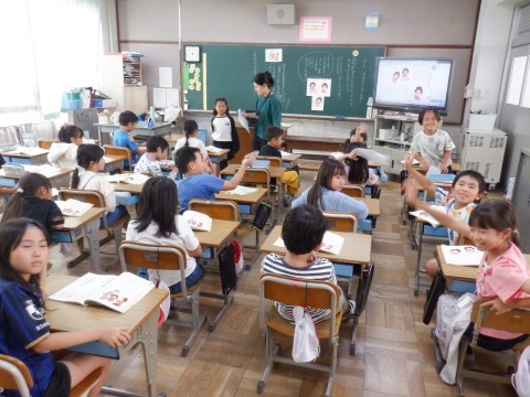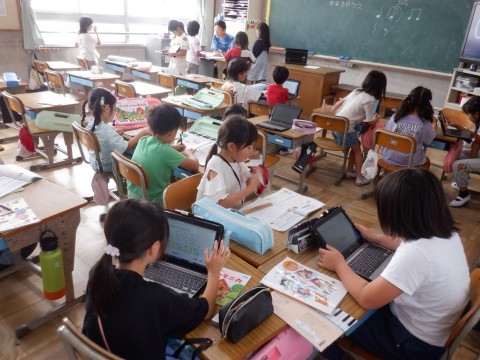 音楽、道徳、図書の時間です。音楽の時間は、デジタル教材の中にあるリズムを作れるソフトを利用してリズムの学習をしています。音符をつなぎ合わせることで、自分のリズムを作ることができます。みんなタブレットに夢中になっていました。