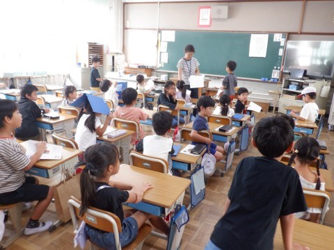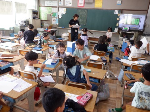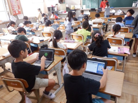 国語、算数の授業です。国語の授業ではタブレットにデータを送ってから授業をします。タブレットの準備をしています。いろんな形で学力向上を目指します。