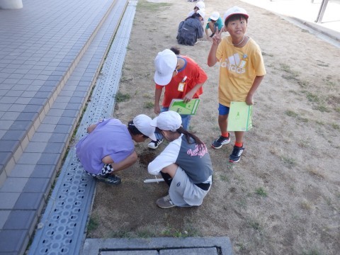 算数、理科の授業です。理科の授業では、温度計を使って土の温度を測っています。日なたと日かげではどれだけ違うでしょうか。実際に測って確認しています。