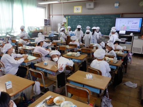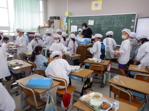 係の児童が手際よく配膳していきます。待っている児童も協力的です。この後、いただきますをしました。