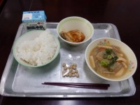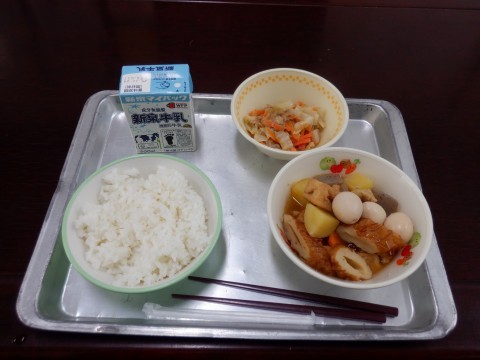 こんぶ入りおでん、白菜のおひたし、ごはん、牛乳です。今日は昼も気温が上がらず肌寒かったので、こんぶ入りおでんの温かさがありがたかったです。子どもたちもしっかり食べました。