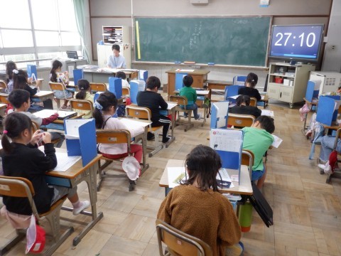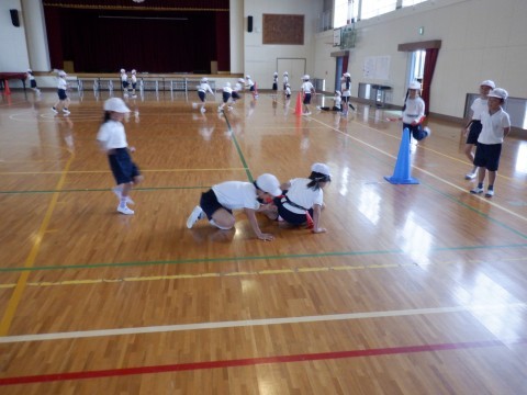国語、体育の時間です。体育は小雨ですが、グラウンドが柔らかくなっているので、体育館で行います。しっぽとり鬼ごっこです。みんな精一杯体を動かしています。今日みたいに肌寒い日にはとてもいい運動になります。