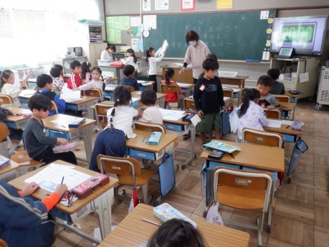 国語、書写、体育です。国語の授業は、正しく伝える方法を学習しています。今日は、花や昆虫など実際の形や様子はどんなのであるか確認しています。これらをことばで上手に伝えられるかな。難しいですけど、頑張ってください。