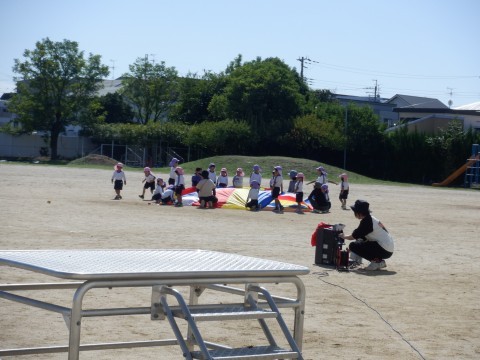 今日は気持ちのよい秋晴れです。今日は白鷺幼稚園の園児が給食時間中に校区運動会の練習に来てくれました。きれいなバルーンをみんなで上げていました。