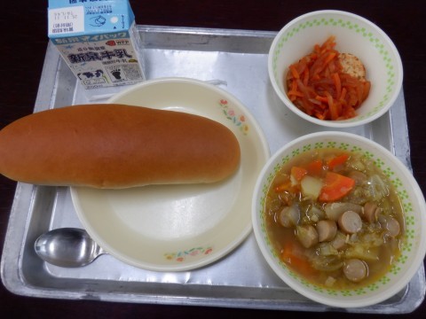 豆腐ハンバーグの野菜ソース、スープ煮、黒糖パン、牛乳です。パンの中でも黒糖パンは上位の人気です。やわらかくて、甘くてみんな大好きです。