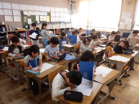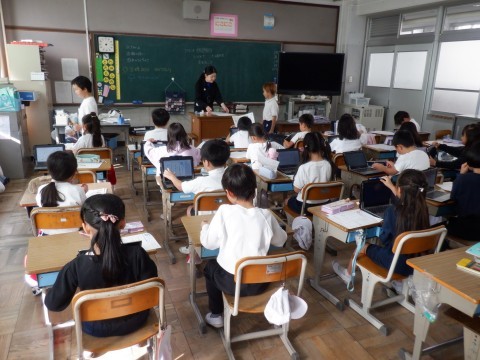 生活、国語、算数の授業です。生活は、おもちゃづくりをしました。昨日体育館で遊びを試すことができました。その反省から、手直しをしています。うまく遊べるようになるかな。しっかり頑張ってください。