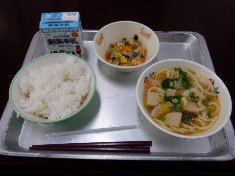 ちゃんぽん麺、小松菜サラダ、しょうゆドレッシング、ごはん、牛乳です。児童たちは麺類も大好きなので、今日もたくさん食べていました。いつもありがとうございます。