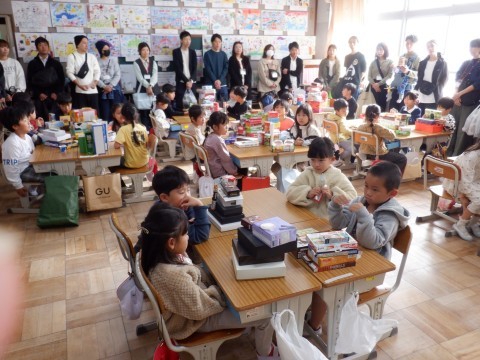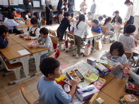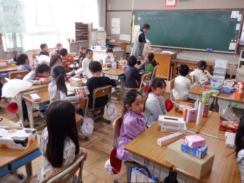 算数の授業です。箱を使って立体の学習をしました。箱にはいろんな形があります。どれとどれが同じ形か調べました。グループで話しながら学習を進めました。