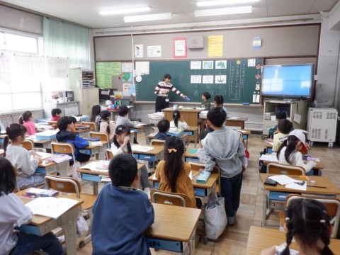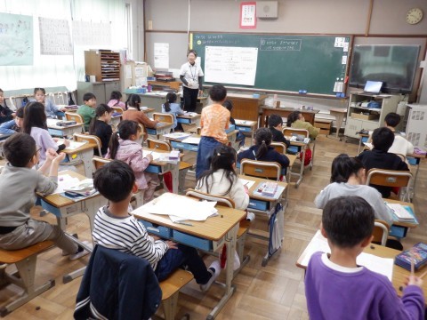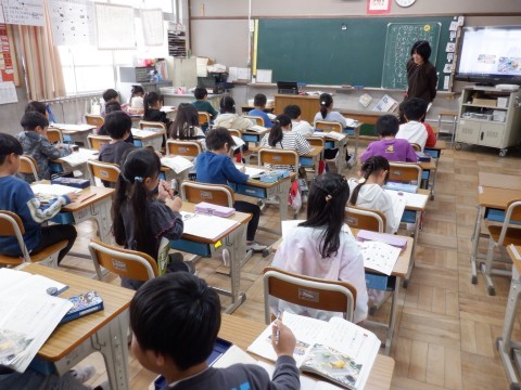 国語、算数の授業の様子です。国語の授業では、漢字の学習をしています。漢字の成り立ちを学習しました。なぜこんな字の形なのかよくわかりますね。みんな興味を持って取り組んでいました。