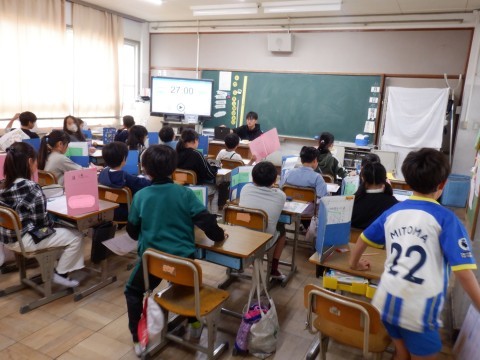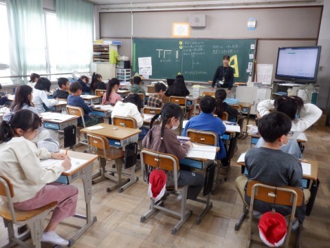 外国語、国語、算数の授業です。算数の授業は、図形の学習です。2つの線のうちどれが平行かを考えました。平行の意味がしっかり分かってないと惑わさせれる問題です。しっかり理解しましょう。