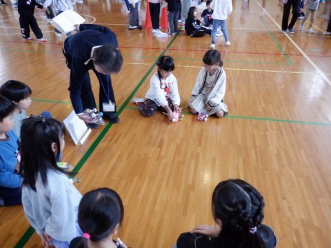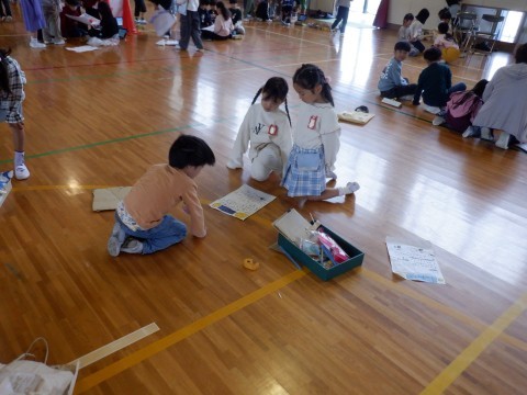 2年生が作ったおもちゃで遊びます。とても自作とは思えない面白いおもちゃもあって1年生もしっかり楽しんでいました。