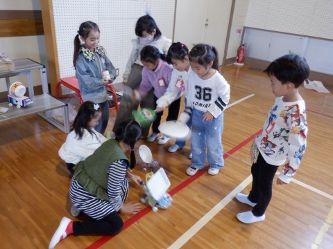 1時間目は、体育館でおもちゃランドをしました。