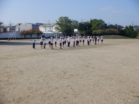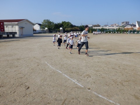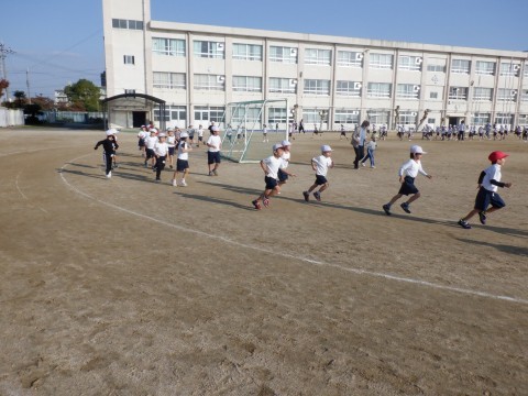 1、2年生も元気いっぱいです。準備体操の後、走り出しました。1周目は先生と一緒に同じペースで走ります。2周目からは各自のペースで走ります。早く走る児童、ゆっくり走る児童とそれぞれです。でも、オーバーペースにならないように調整してください。頑張ろう。