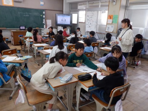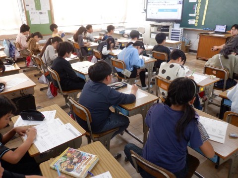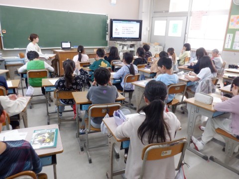 各教室でリモートで行われました。あらかじめ用意されたワークシートと大型テレビに映し出される画像を使って説明がされていきます。途中こんな時にはどうしたらよいかグループで考える時間もありました。みんなしっかりと学習しました。