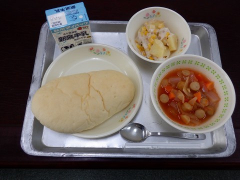 ミネストローネ、ツナとポテトのマヨネーズ風味焼き、オリーブパン、牛乳です。ミネストローネは、トマト風味のスープで児童たちにも大人気です。