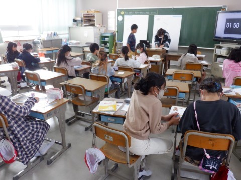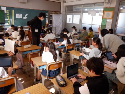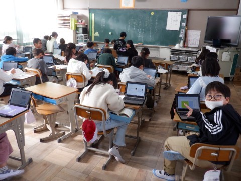 算数、国語の授業です。国語は、「工芸品のみりょく」を学習しています。タブレットを使ってリーフレットを作っています。その工芸品について限られた範囲で伝えないといけません。難しいですね。頑張ってください。