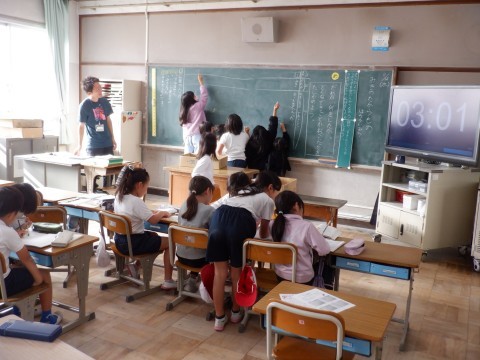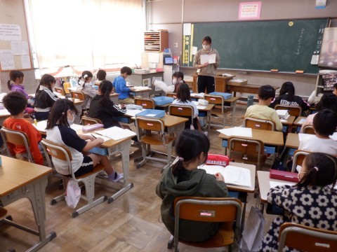 この時間は全クラスが国語の授業をしていました。「みきのたからもの」を学習しています。内容をまとめていっています。どんなことに気づいたかな。しっかり発表しましょう。
