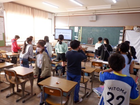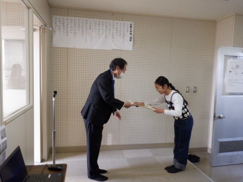 校歌をみんなで歌い、朝のあいさつの後、教頭先生からお話がありました。友だちのよいところを見つけよう。そして、みんなが成長できるように頑張ろう。という内容でした。次に表彰がありました。読書感想文コンクール、はとぶえコンクール、大阪府学生科学賞の表彰です。読書感想文コンクールでは入選、大阪府学生科学賞では府知事賞をいただきました。素晴らしいことです。