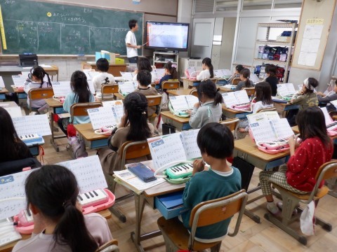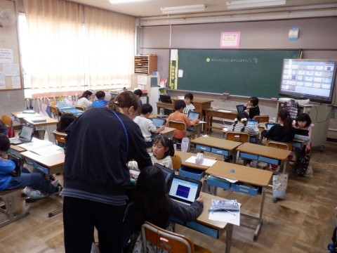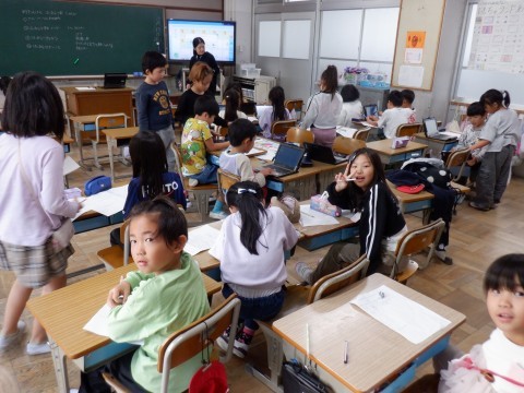 音楽、生活の授業です。生活は町たんけんの発表を予定しています。その発表の準備をしました。班ごとに何を発表するかを決めて、タブレットに資料を集めたり、内容を考えたりしました。頑張っています。