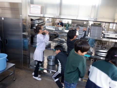 給食係が食器などを運んできます。給食室には給食委員さんが待ってくれていて片づけを手伝ってくれます。いつもご苦労様です。