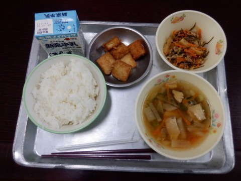 厚揚げの田楽、海そうきんぴら、船場汁、ごはん、牛乳です。船場汁は大阪の郷土料理です。しょうががきいたすっきりしたしょうゆ味です。