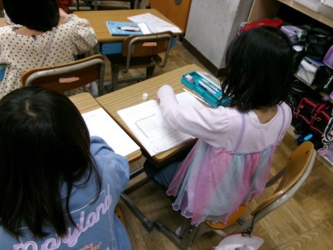 算数と書写の様子です。算数の時間では,かけ算の答えが書かれたカードをできるだけ早くとるゲームに挑戦しながら理解を深めていました。