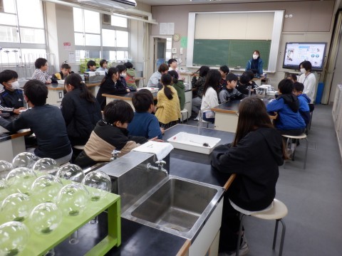 算数、理科の授業です。理科の授業ではこれから行う実験のために理科室の使い方や器具の使用方法を学習しました。メスシリンダーは液体の体積を測る器具ですが、使うときの約束や測り方があります。その学習も器具を使いながらしっかりしました。