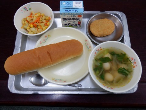 堺のめぐみコロッケ、三色ソテー、ちんげん菜とうずら卵のスープ、コッペパン、牛乳です。堺のめぐみコロッケには、堺産の小松菜が入っています。カラッと揚がっていて好評でした。