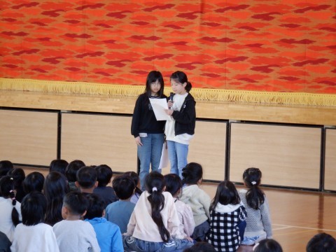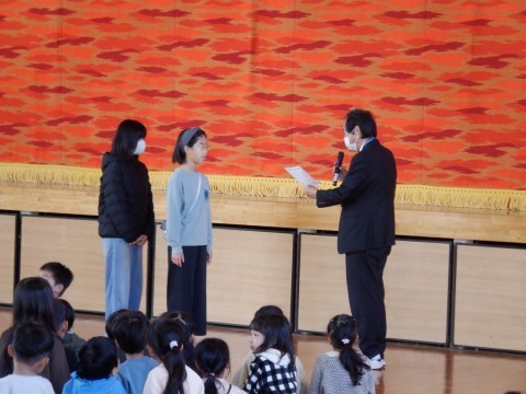 児童会役員で司会進行を務めてくれました。朝のあいさつ、校長先生のお話の後、12月の目標についてのお話がありました。終業式に向けての取り組みもありますが、普段から気をつけよう。自学1グランプリの表彰がありました。自主学習で頑張った児童を表彰しました。読書感想文コンクールの表彰もありました。児童会から、ろうか歩行運動、募金活動についての報告がありました。
