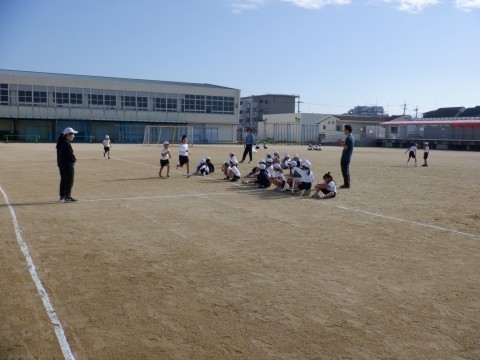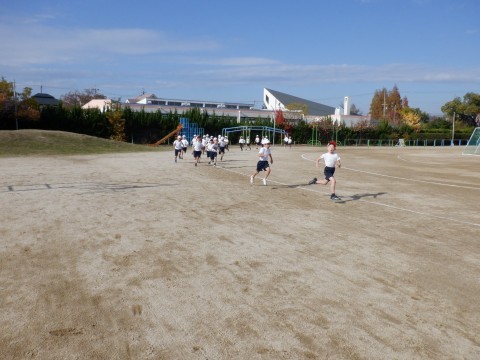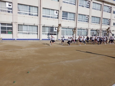 グラウンドをコースに従って5周します。みんな一生懸命に走りました。とても天気が良く絶好のかけ足日和で、みんな気持ちよさそうに走っていました。