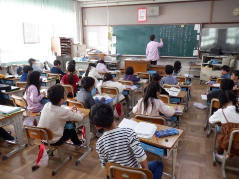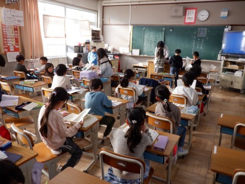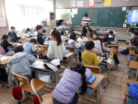 全クラス国語の授業です。初めに漢字のスキルなど宿題の点検をした後、今日の授業に入りました。物語を作ってみようという内容です。動物を主人公にして物語を作ります。どんなお話になるかな。