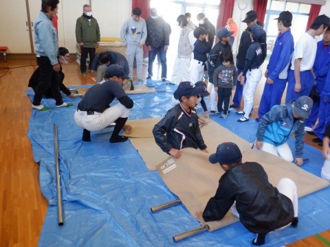 体育館で開会式の後、3つの班に分かれて訓練を行いました。簡易の担架のつくり方、段ボールベッドの組み立て方、煙の中での避難方法、水を使った訓練など順に行いました。最後に炊き出しのおにぎりや保存用の食品をいただき、訓練は無事終了しました。