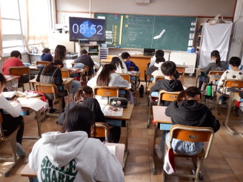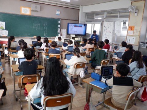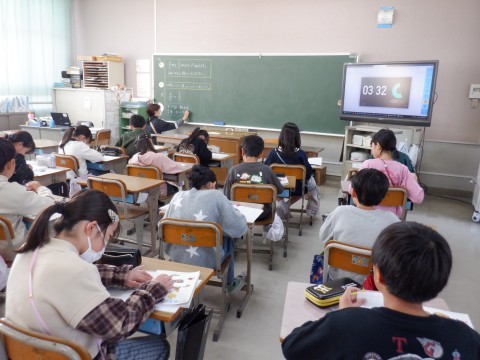 算数、総合の授業です。算数の授業は分数の学習です。たし算は分母がそろっている数のたし算です。しっかり考えて答えを出してください。まだまだ難しくなりますよ。頑張ってください。