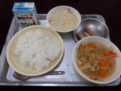 かけたらクリームドリア、焼きウインナー、コンソメスープ、ごはん、牛乳です。時間につれて風も強くなってきて、寒くなってきました。あたたかいメニューはほっとします。