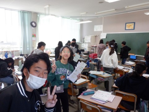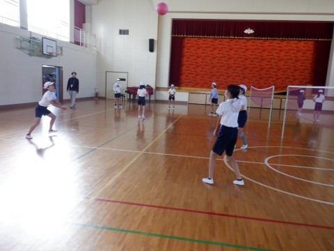 外国語、体育の授業です。体育は体育館でバレーボールの学習です。パスやレシーブなどの練習です。これがなかなか難しく、輪になって練習していますが簡単には続きません。しっかり頑張ってください。