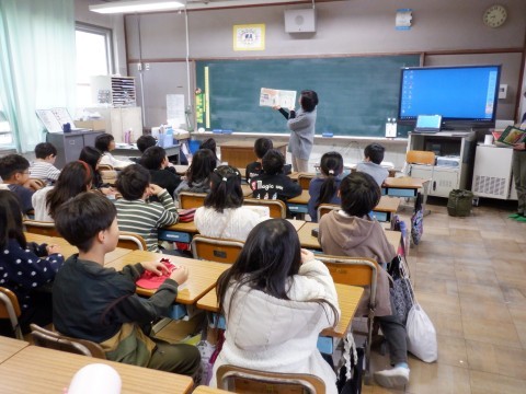 今日も楽しい絵本の読み聞かせです。12月以外のサンタさんはいったい何をしているのでしょう。絵本の楽しい世界です。児童たちもしっかり聞いていました。