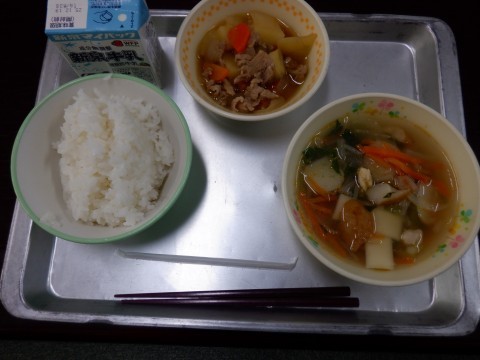 中華風肉じゃが、ワンタン、ごはん、牛乳です。中華風肉じゃがもワンタンも中華メニューで児童たちにも好評でした。