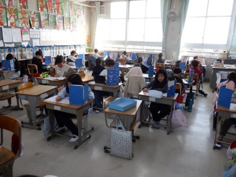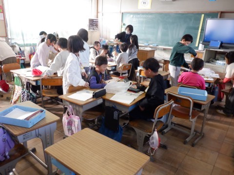 国語、算数の授業です。算数の授業では、天びんを使って重さの学習をしています。重さの単位や数え方などを学習しています。大切な学習です。