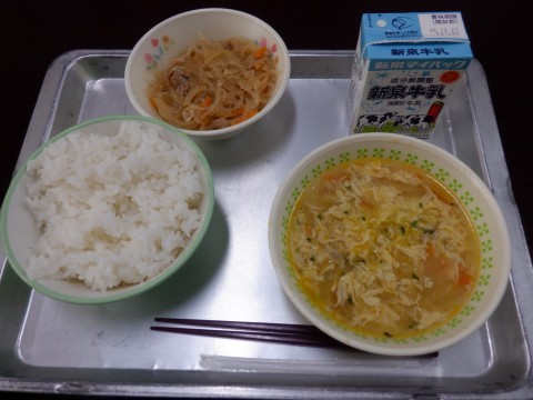 麻婆春雨、中華風卵とコーンのスープ、ごはん、牛乳です。今日は中華メニューです。食べなれた味で児童たちにも好評でした。