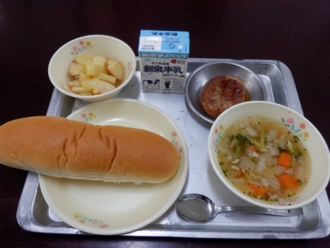 今日はお楽しみ献立です。ハンバーグのソースかけ、冬野菜スープ、とろりフルーツコンポート、ミルクパン、牛乳です。とろりフルーツコンポートは甘いデザートです。子どもたちに大人気です。