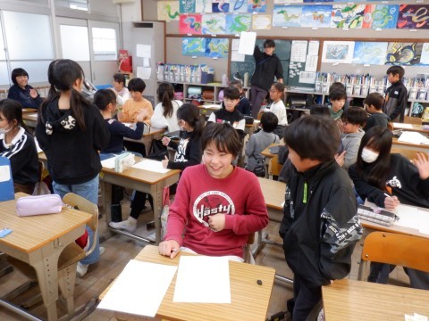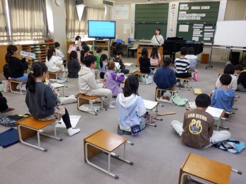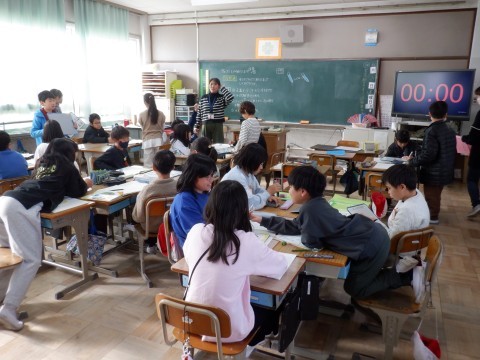 音楽、国語、理科の授業です。国語の授業は、先生が描いた図をペアの1人が言葉で伝えます。それを聞いてもう1人が図に描きます。簡単そうでなかなかうまく描けません。伝える側も聞く側も簡単にはいかないですね。いい学習です。
