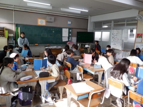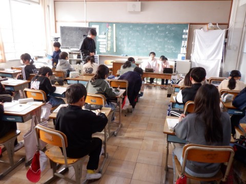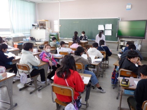 算数、国語の授業です。国語の授業では、説明文を考えています。グループごとでどのグループがうまく、わかりやすく説明できるかを競っています。どんな工夫ができるかな。考えてみてください。
