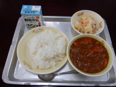 ハヤシライス、ポテトサラダ、マヨ風ドレッシング、ごはん、牛乳です。ハヤシライスのポテトサラダも子どもたちには大人気です。たくさん食べていました。