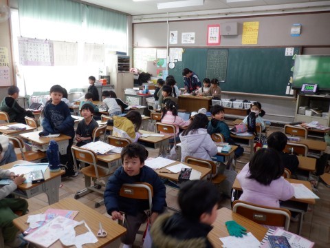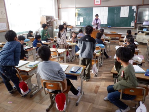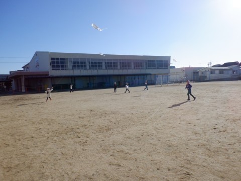 生活、国語の授業です。生活の授業は、昔遊びのたこあげをしています。グラウンドをいっぱいに使って凧あげをしています。風を上手に受けて高く上がっている凧もありました。けっこう難しいです。頑張ってください。