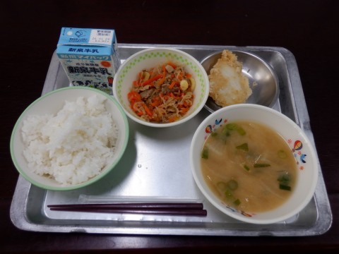 かれいのからあげ、糸こんにゃくのうま煮、みそ汁、ごはん、牛乳です。かれいのからあげは、白身の魚でカラッとあがっていて児童たちにも食べやすかったようです。