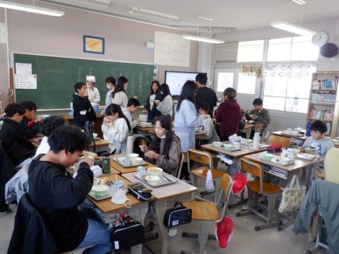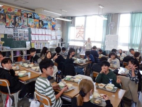 6年生は準備がすっかり終わって、いただきますをしました。みんなでおいしくいただいています。今日で2学期最後の給食です。本当に毎日おいしい給食をありがとうございます。