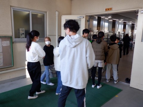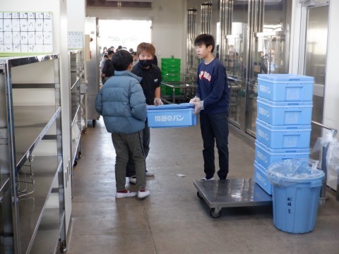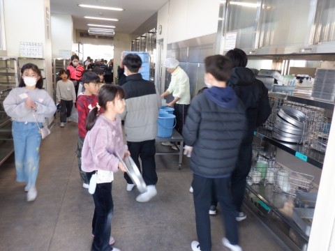 各教室で後片づけを終わった後、給食係のみなさんが給食場まで運んできます。そこで感謝の気持ちを込めて「ごちそうさまでした。」と言ってから運び込みます。いつもご苦労様です。給食委員さんたちもしっかり働いてくれています。