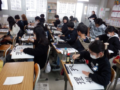 社会、書写の授業です。社会の授業は歴史を学習しています。明治時代の不平等条約について考えました。実際にあった出来事などからなぜ不平等なのかを意見を出し合いました。難しい内容です。頑張ってください。