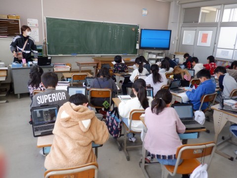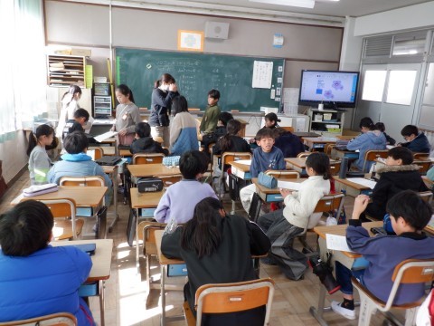 国語、体育、社会の授業です。体育の授業は、グラウンドでなわとびをしています。今日は風がやや強く寒く感じますが、子どもたちは元気よくなわとびに取り組んでいます。たくさん飛べるように頑張ってください。