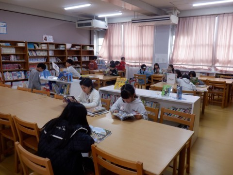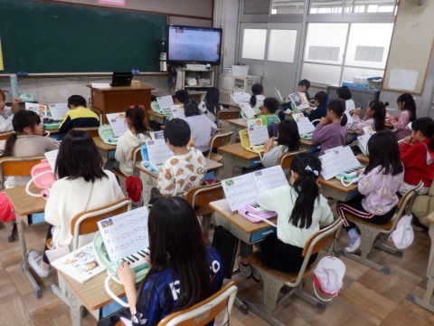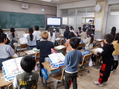 音楽、図書の授業です。音楽の授業では、「あんたがたどこさ」を歌っています。てまり歌だけあってとてもテンポのいい曲です。実際にまりはつけないので手拍子でまりをつくところや足抜きのところを表現しています。みんな楽しそうです。